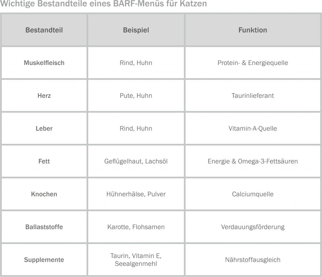 Ein BARF-Menü soll die natürliche Beute möglichst naturgetreu nachbilden. Muskelfleisch liefert Energie und Eiweiß, Herz versorgt die Katze mit Taurin und Leber mit Vitaminen. Knochen oder Eierschalen liefern Calcium, während Fett als Energieträger wichtig ist.