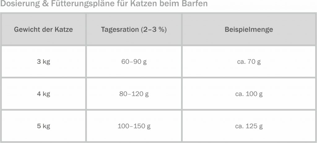 Die tägliche Futtermenge beträgt etwa 2–3 % des Körpergewichts. Mithilfe eines BARF-Rechners oder einer tierärztlichen Futteranalyse lassen sich diese Werte präzise bestimmen.