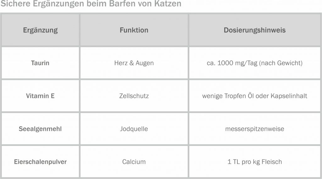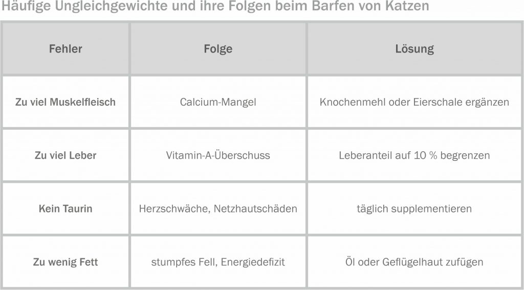Wer ohne Plan barft, riskiert eine falsche Nährstoffbalance. Katzen benötigen exakt abgestimmte Mengen an Protein, Fett, Vitaminen und Mineralstoffen. Eine zu hohe Menge an Muskelfleisch und eine zu geringe Menge an Knochen kann zu Calciummangel führen, während ein Taurinmangel Herz und Augen schädigen kann.