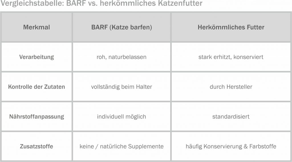 BARF steht für „Biologisch Artgerechtes Rohes Futter”. Dabei orientiert man sich bei der Ernährung an der natürlichen Beute der Katze und verwendet frisches Fleisch, Innereien, Knochen und Supplemente. Das Ziel ist eine naturnahe und unverarbeitete Fütterung.