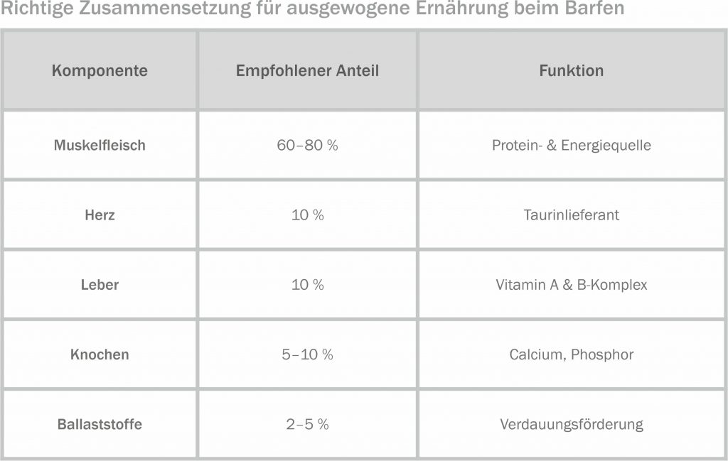 Beim Barfen ist das richtige Gleichgewicht entscheidend: Zu viel Muskelfleisch kann zu einem Calcium- und Vitaminmangel führen, während zu viel Leber zu einer Überversorgung mit Vitamin A führen kann. Wenn Taurin vergessen wird, kann das Herz darunter leiden.