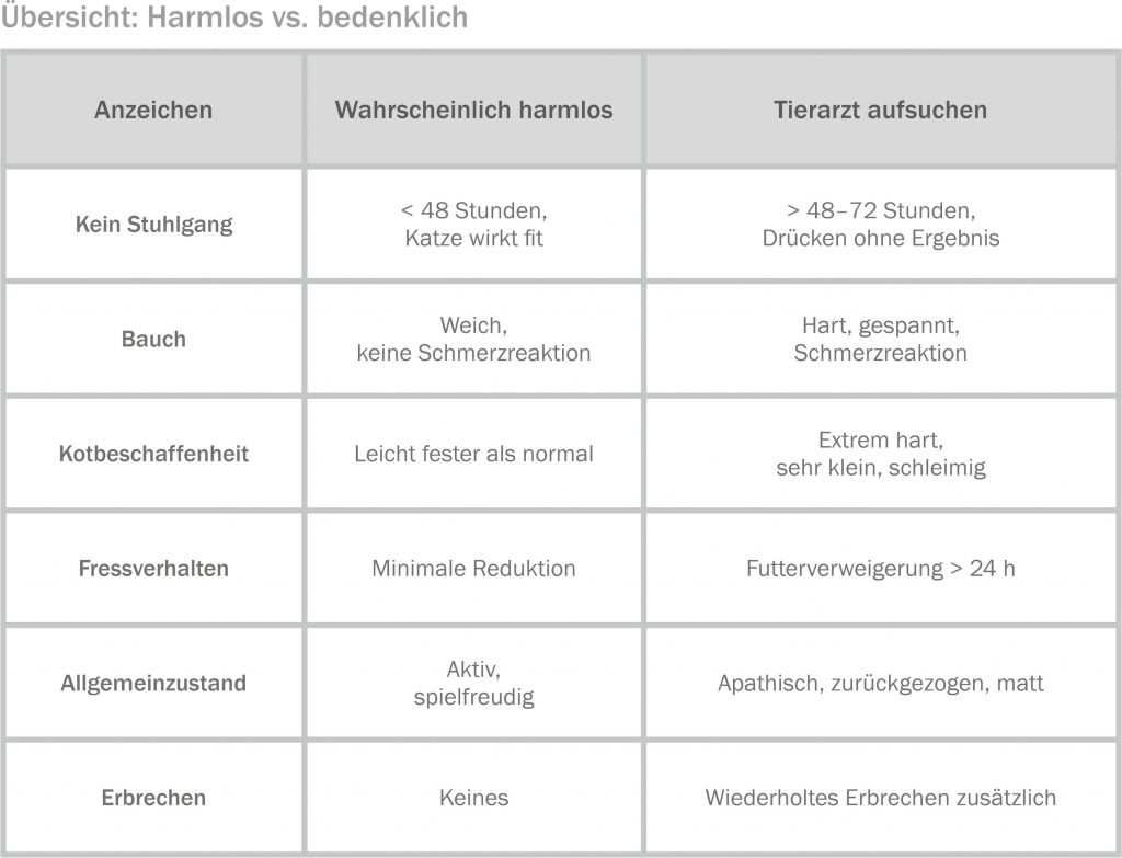 • Warte bei anhaltender Verstopfung, Erbrechen, Schmerzen oder Apathie nie ab – suche den Tierarzt auf.