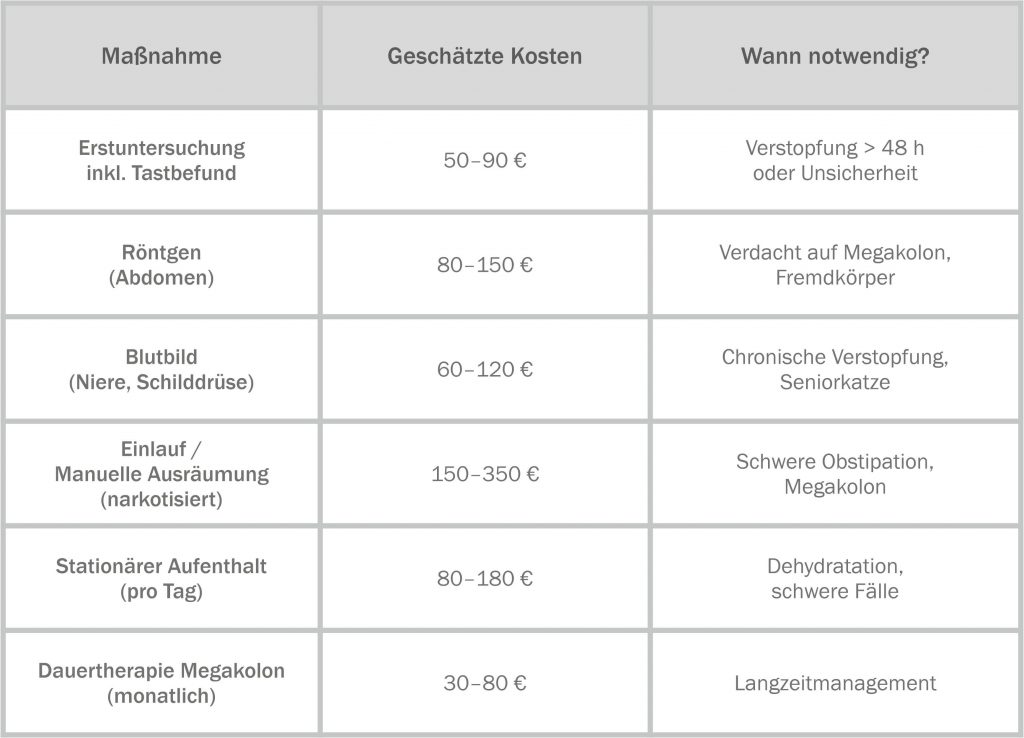 Je nach Schweregrad können durch Verstopfung sehr unterschiedliche Kosten entstehen. Die folgende Tabelle dient als Orientierungshilfe. Bitte beachte, dass die tatsächlichen Kosten von der Region, der Praxis und dem individuellen Befund abhängen.