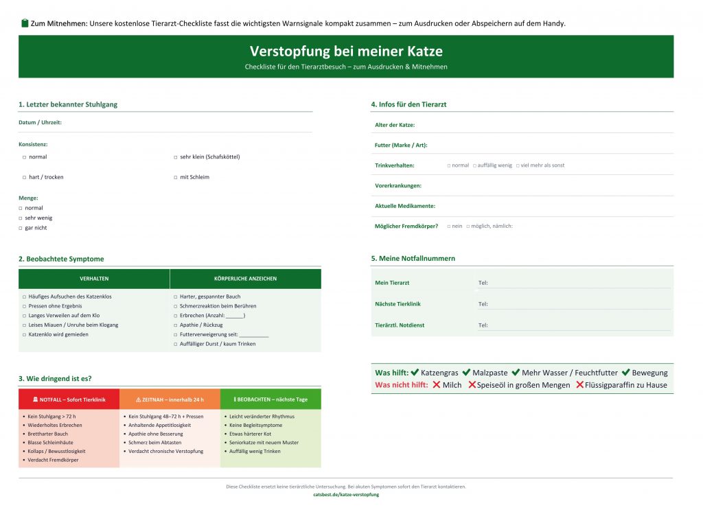 Diese Frage lässt sich eindeutig beantworten: Lieber einmal zu früh als einmal zu spät! Sobald Begleitsymptome auftreten oder die Verstopfung hartnäckig anhält, solltest du deine Katze einem Tierarzt vorstellen. Die folgende Checkliste gibt dir Orientierung.