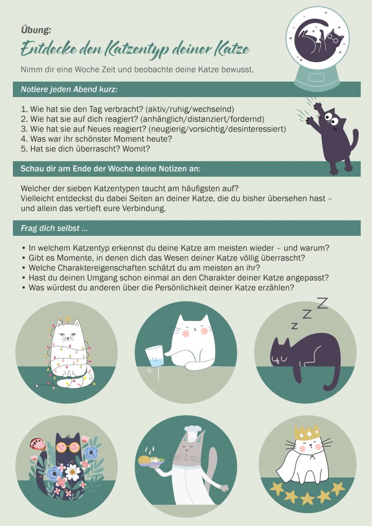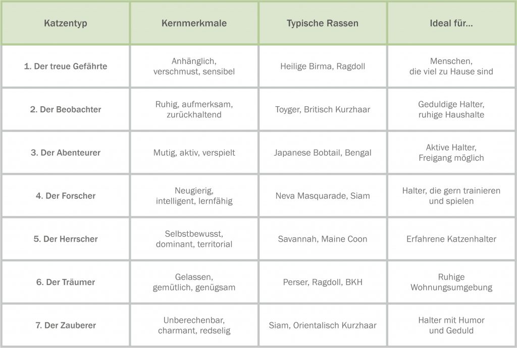 Es gibt sieben typische Katzentypen: den treuen Gefährten, den Beobachter, den Abenteurer, den Forscher, den Herrscher, den Träumer und den Zauberer.